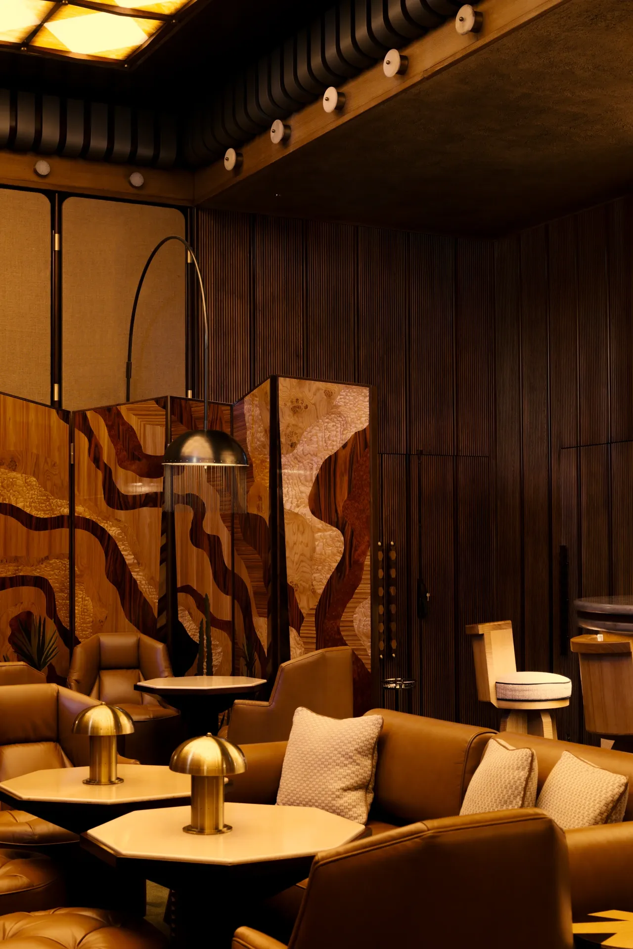 A pewter counter serving as the bar, an imposing amber glass chandelier, screens with Riviera-inspired patterns, wood paneling, a checkered glass ceiling, and custom-made furniture such as cognac leather armchairs and enamel lava tables: every detail, at the Jean Paul’s Members’ Bar, contributes to giving this place a cozy, intimate atmosphere.