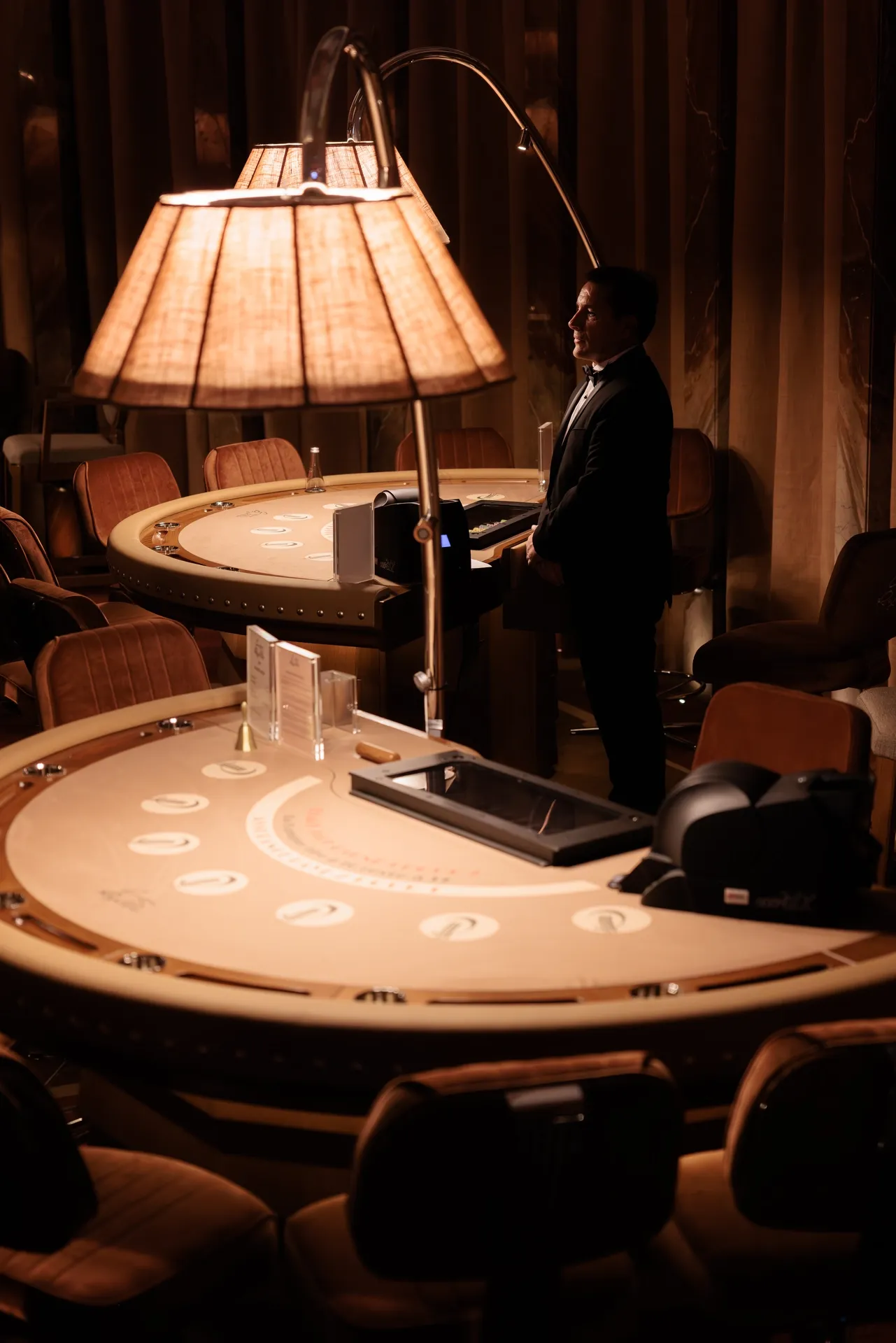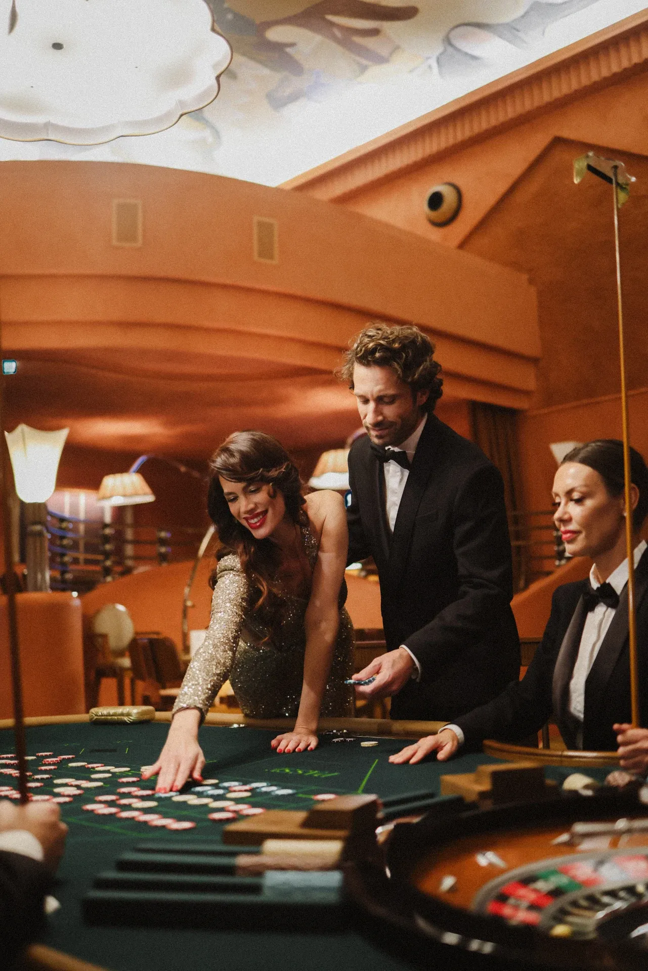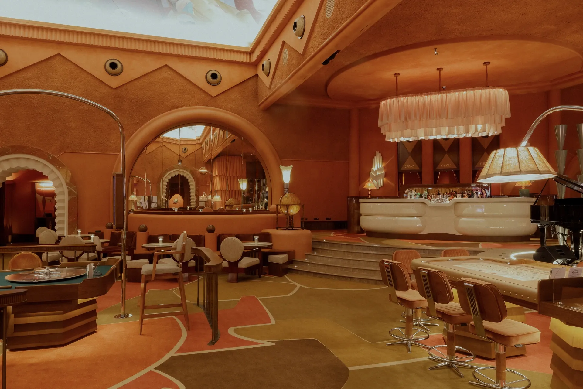 The Casino rivals elegance with its majestic ceiling height, its play of volumes, its variations of pastel and terracotta tones, and its hand-painted frescoes. Soft lighting completes the venue’s unique ambiance.