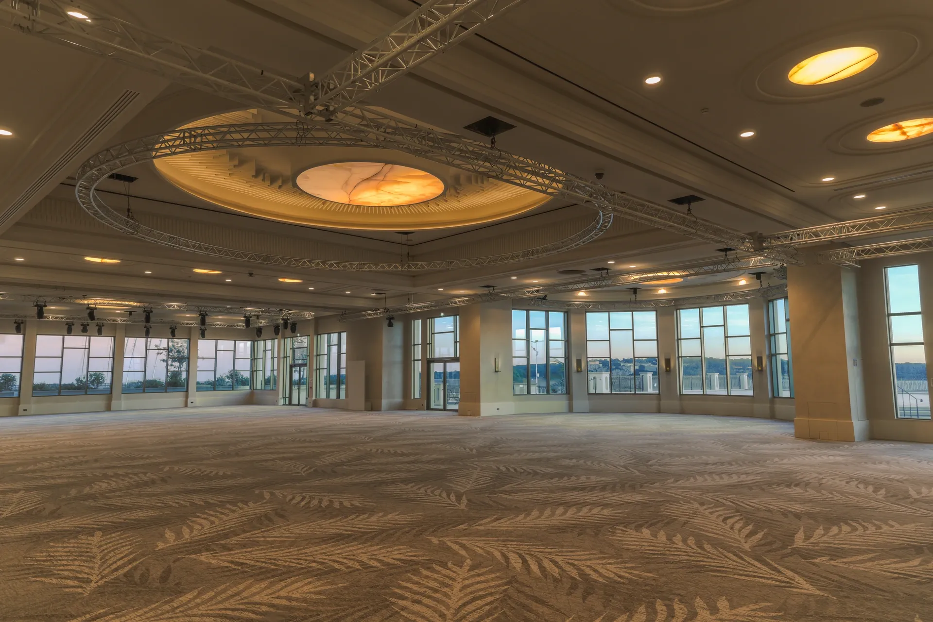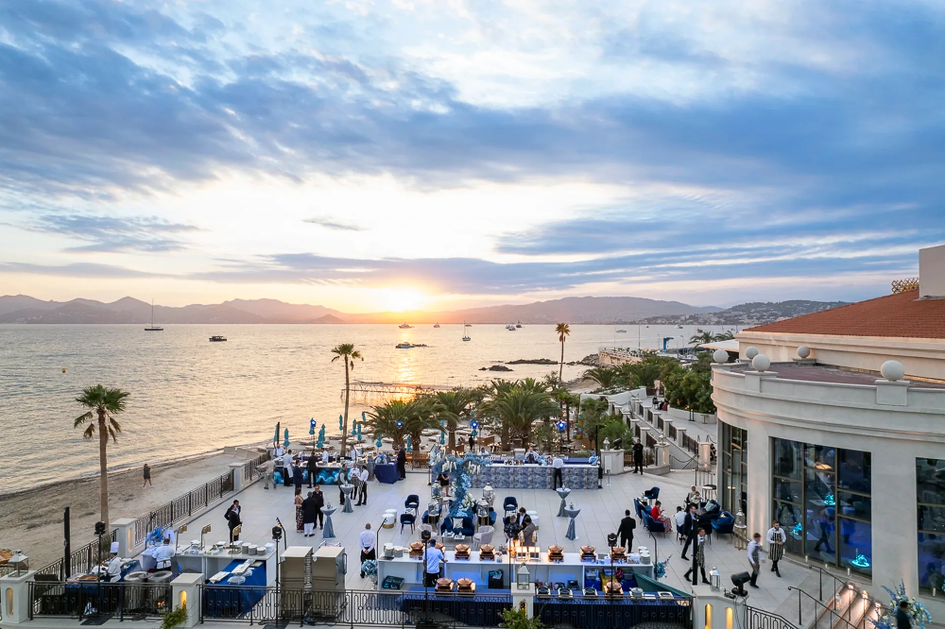 Located within the luxurious Palm Beach entertainment complex, the Alain Delon Room stands as a prestigious venue for extraordinary events. With an impressive floor space (1,000 square meters / 10,764 square feet) and terrace (600 square meters / 6,458 square feet), this event space offers an incomparable panorama of the Lérins Islands. The ceiling fixture, a true testament to craftsmanship, accentuates the wall ornamentation and grand ceiling height. The tall windows bathe the room in a soft, clear light.